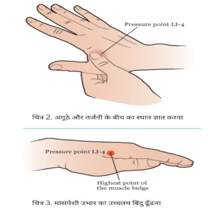 एक्यूप्रेशर पॉइंट्स को 30 सेकंड से 1 मिनट तक दृढ़ता से दबाएं.