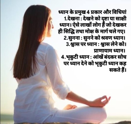 ध्यान के प्रकार और ध्यान की विधियों में अंतर है। ध्यान कई प्रकार का होता है जिसके अंतर्गत कई तरह की विधियां होती हैं। आओ जानते हैं इस संबंध में संक्षिप्त जानकारी। ध्यना के 4 प्रमुख प्रकार . देखना : देखने को दृष्टा या साक्षी ध्यान। ऐसे लाखों लोग हैं जो देखकर ही सिद्धि तथा मोक्ष के मार्ग चले गए। इसे दृष्टा भाव या साक्षी भाव में ठहरना कहते हैं। आप देखते जरूर हैं, लेकिन वर्तमान में नहीं देख पाते हैं।...