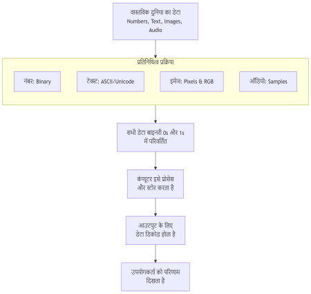 सरल परिभाषा: कंप्यूटर बिजली से चलने वाली मशीनें हैं। वे सिर्फ दो ही states समझते हैं: ON (1) और OFF (0)। इसलिए, हर तरह का डेटा-नंबर, टेक्स्ट, तस्वीर, आवाज-को कंप्यूटर के लिए 1 और 0 की भाषा में बदलना पड़ता है। इस भाषा को बाइनरी नंबर सिस्टम कहते हैं।